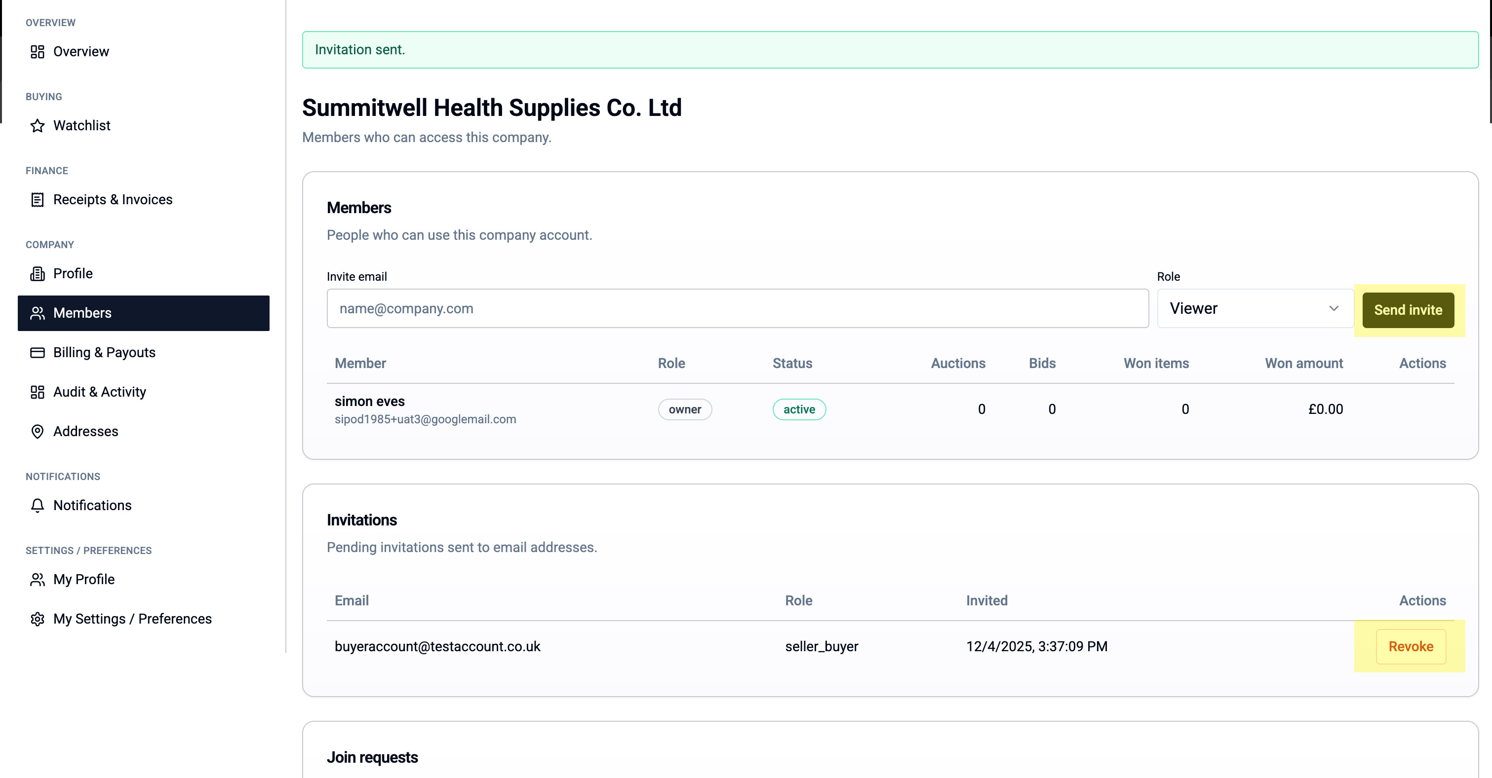 The invitation will appear in the "Invitations" list until accepted. You can click "Revoke" to cancel an invitation.