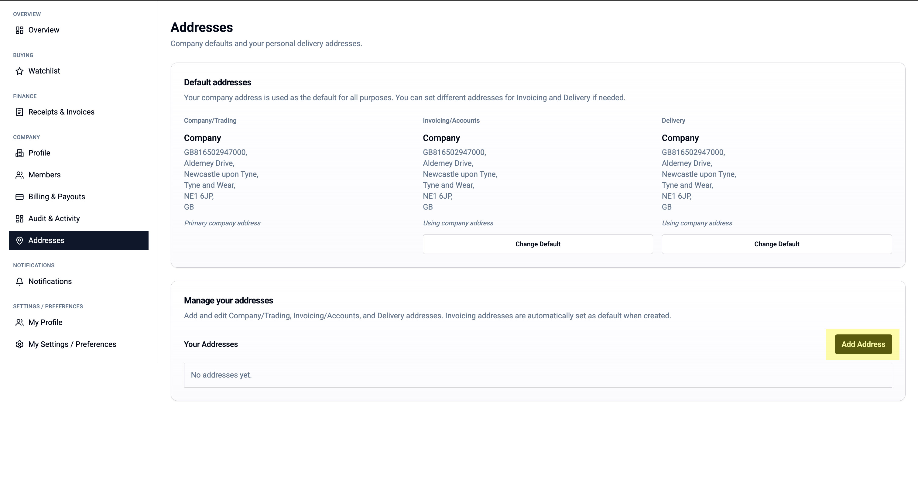 - Still on Company > Addresses, click "Add Address" again